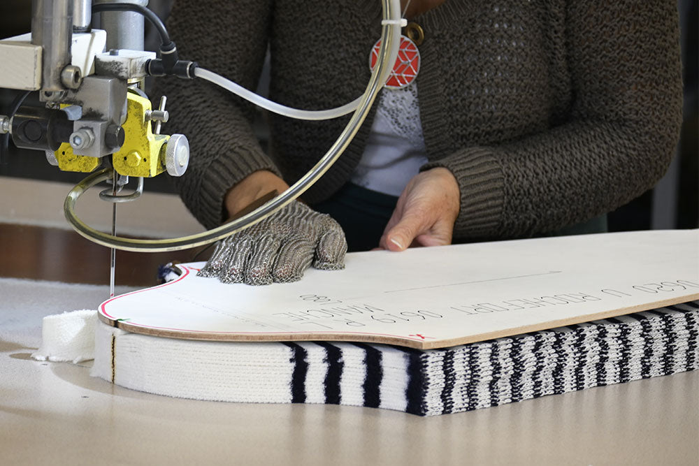 Una vez tejidos y estabilizados los paneles, la siguiente etapa es el corte, que se realiza meticulosamente siguiendo patrones precisos para garantizar una simetría y un ajuste perfectos. A continuación, nuestras expertas costureras ensamblan los paneles con una destreza sin igual. Realizan las costuras, los remates y los retejidos, y terminan con cuidado las bandas abotonadas y el cuello para mantener la elasticidad y la forma del jersey.